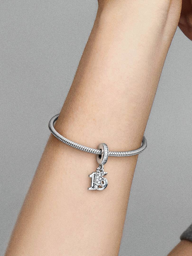 Celebrate a sweet 15th birthday with the 15th Birthday Dangle Charm. Hand-finished in sterling silver, this charm includes the number 15 with a polished front and back with micro beads and heart-shaped bead details, plus