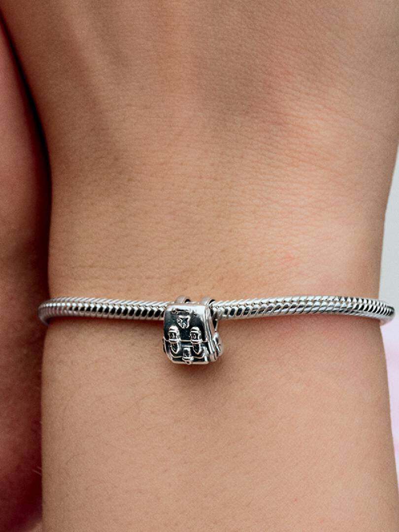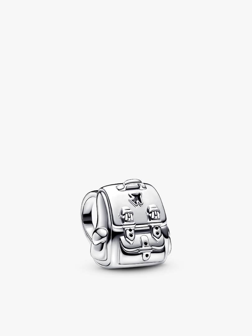 Heed the call for adventure with the Adventure Backpack Charm. A scaled-down sterling silver backpack features realistic details including wraparound straps, handle, buckles and pocket. An airplane symbol is imprinted on