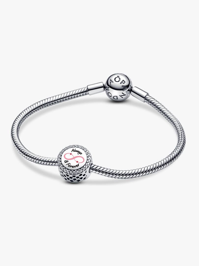 t of the charm is a delicate pink circle, beautifully inscribed with “Always & Forever” in elegant lettering, while a timeless infinity symbol sits at its center, representing endless connection. The back of the charm offers space for personal engraving, making it a perfect keepsake to commemorate a special bond, anniversary, or milestone. Whether given as a gift or worn as a daily reminder, this charm captures the beauty of love that lasts forever.