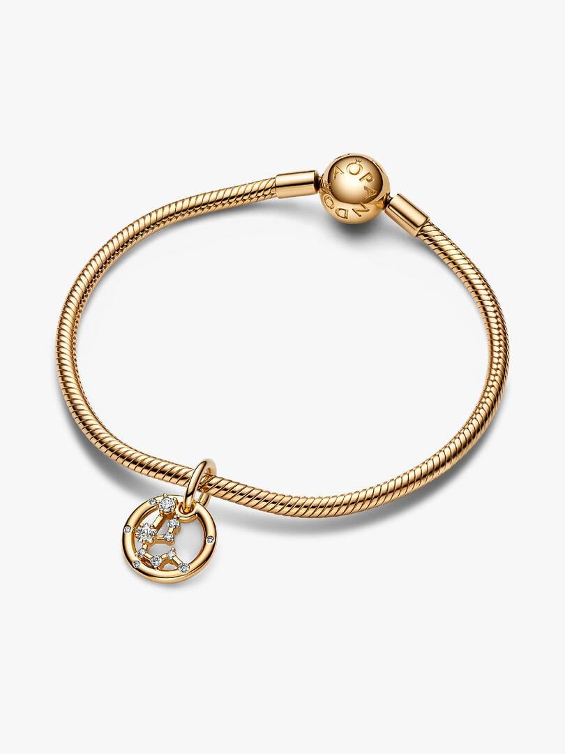 Let the stars guide your look with the brand Aquarius Zodiac Dangle Charm. The dangle is crafted our 14k gold-plated unique metal blend, has a circular outer frame and features clear sparkling cubic zirconia as well as