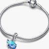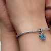The Blue Murano Glass Elephant Dangle Charm is a colorful ode to a majestic creature. Sterling silver forms an elephant-shaped silhouette around a gradient blue-and-purple Murano glass with a raised ear and a concave rou