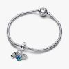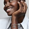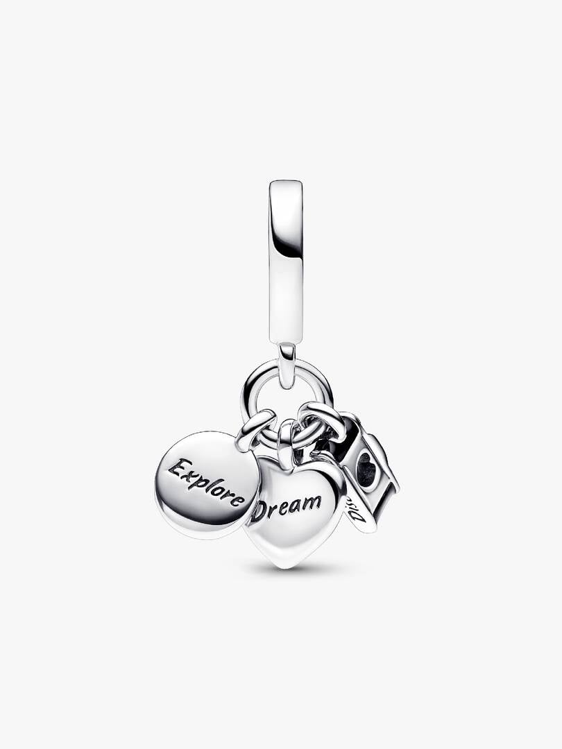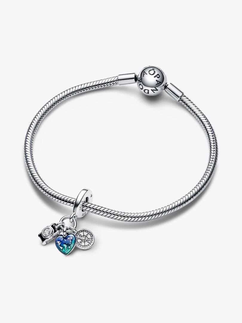 as the lens, a heart-shaped map of the world with blue and green gradient enamel and a compass with a fixed orienteering arrow. “Discover”, “Dream” and “Explore” are engraved on the backs of the dangles. Style it together with your favorite charms from your travels as a reminder to always keep exploring.
