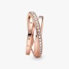 Triple your style with the Crossover Pavé Triple Band Ring. This classic yet modern 14k rose gold-plated ring boasts three interconnected bands. The top band features clear cubic zirconia pavé and overlaps over the other