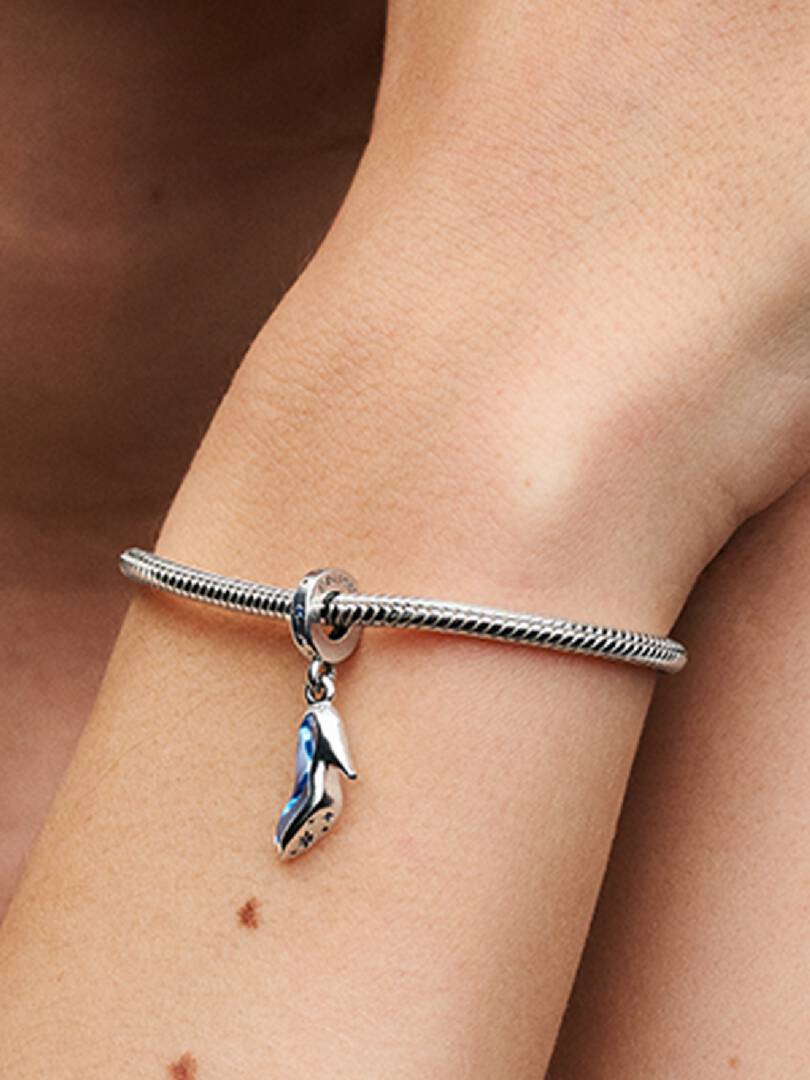 Have your own glass slipper moment with the Disney Cinderella’s Glass Slipper Dangle Charm. Cinderella’s famous glass slipper is reimagined as a sterling silver charm with dreamy light blue man-made crystal. The bail and