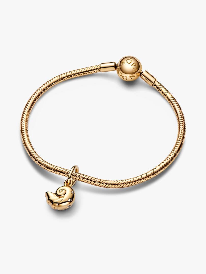 Come out of your shell with our Disney The Little Mermaid Enchanted Shell Dangle Charm. Hand-finished in 14k gold plating, this charm features grooved lines and a realistic spiral effect, along with four sparkling round