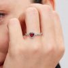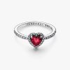 Add a dash of love to your look. In this sterling silver ring, a heart-shaped red stone takes center stage, raised slightly for extra impact. A cubic zirconia halo and sparkling pavé on the front half of the band make th