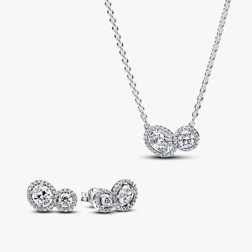 Celebrate the beauty of connection with the Embracing Halo Jewelry Set. Featuring a necklace and earrings with sparkling round and oval stones, linked by a pavé halo, symbolizing the bond between loved ones.