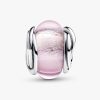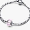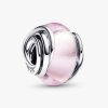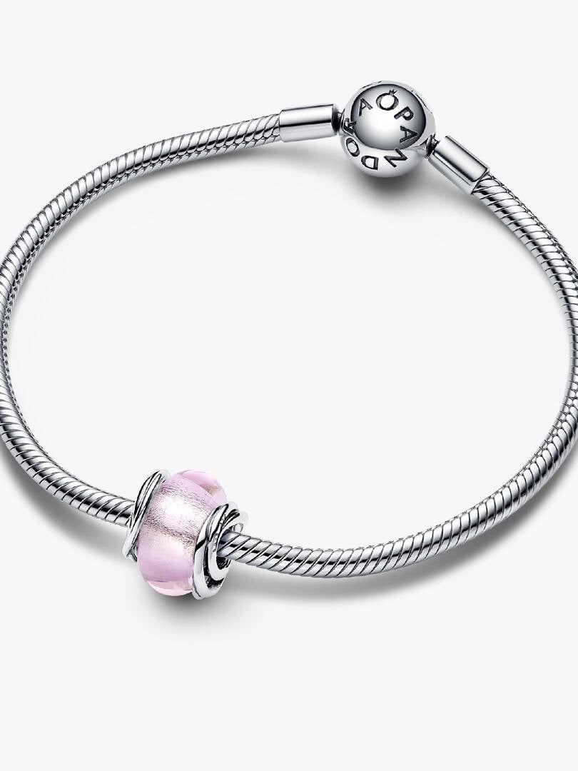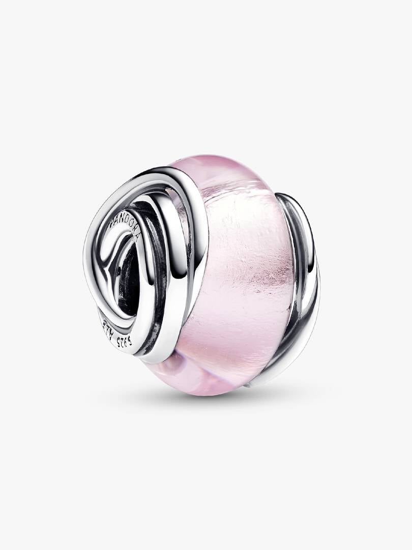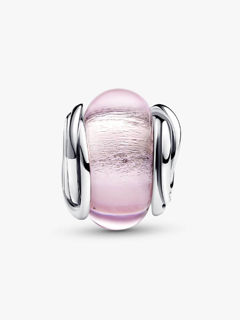 Crafted from sterling silver, the Encircled Pink Murano Glass Charm elegantly captures infinite love. The pink Murano glass is adorned with silver foil on the inside, adding an extra layer of shine. The asymmetrical enci