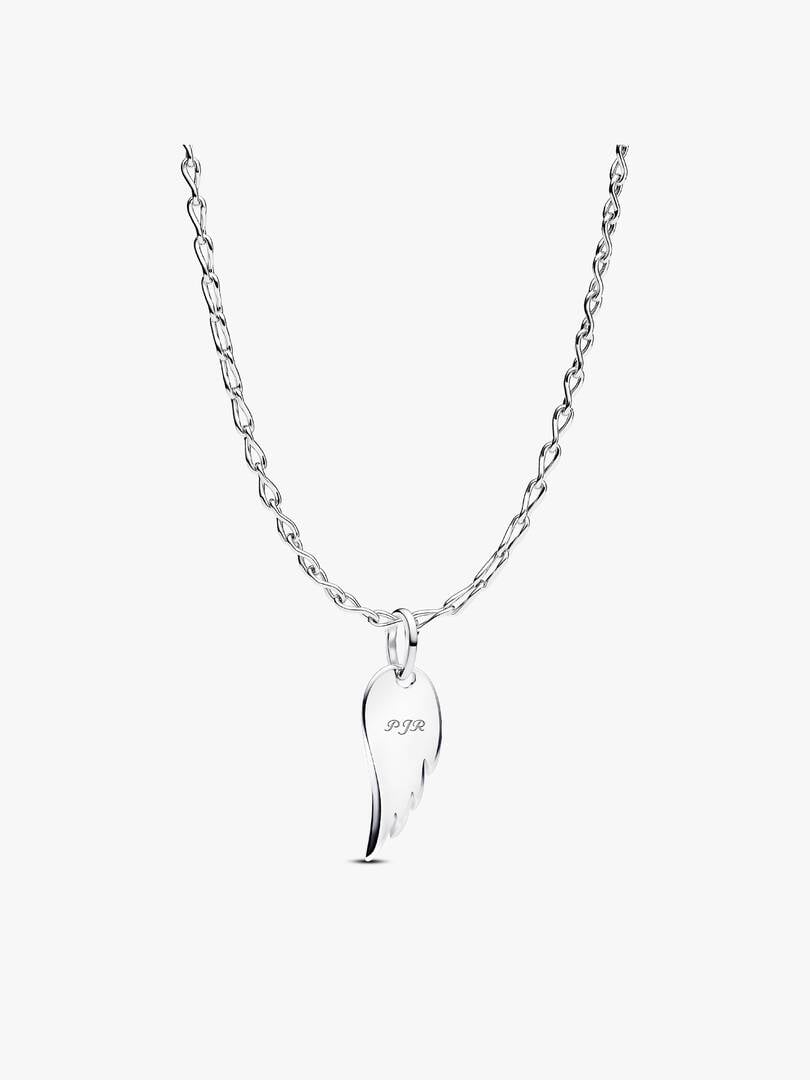Spread your wings. Leave your mark. Designed for longer messages, our sterling silver angel wing pendant offers more room to say what matters. Pair with our adjustable infinity chain and let your words lift you up.