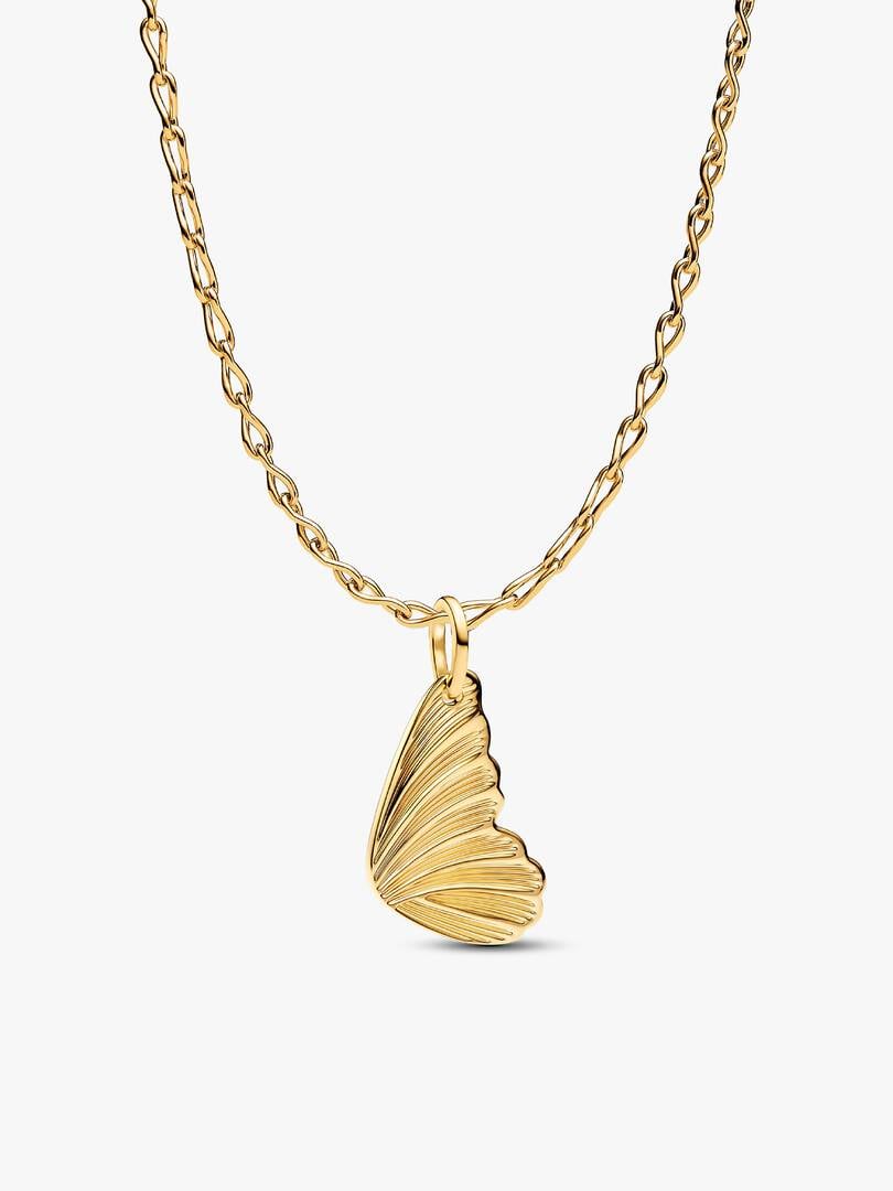 Say more. Shine more. Our oversized 14k gold-plated butterfly pendant features a textured wing on one side and a polished finish on the other. Pair with our adjustable infinity chain and let your story take flight.