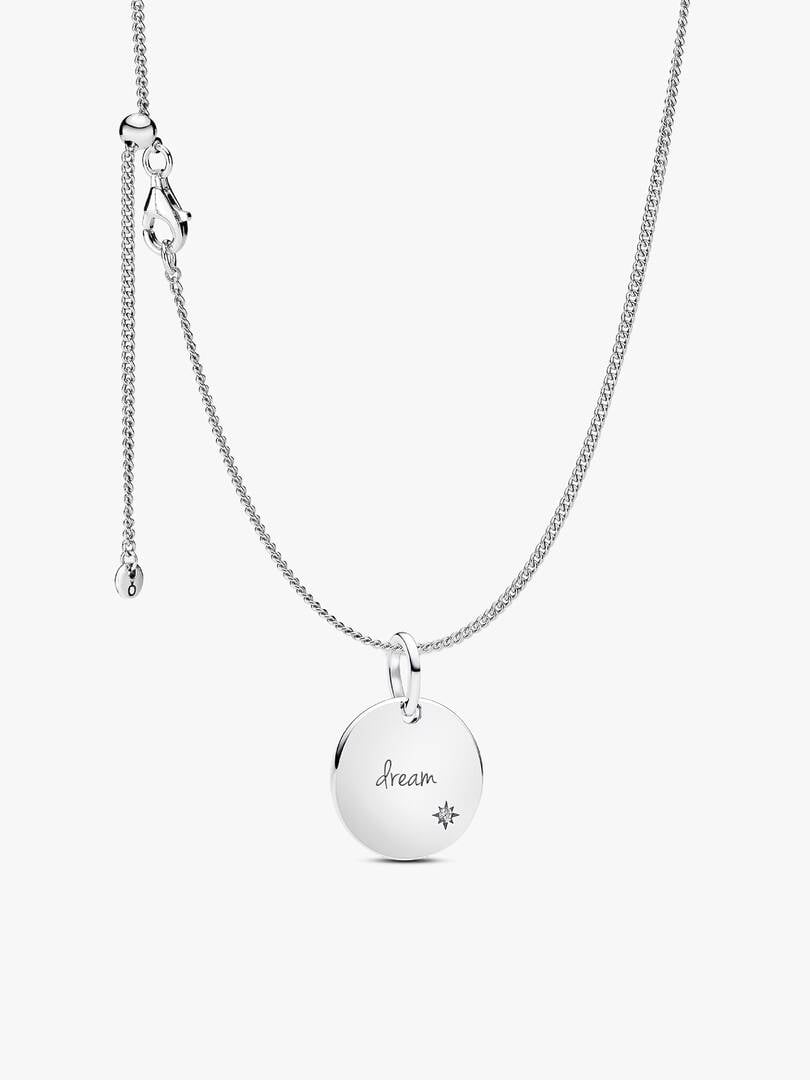 Designed for longer messages, our oversized sterling silver round tag pendant features a radiant lab-grown diamond in a star-shaped setting. Pair with our adjustable curb chain to make a brilliant statement.