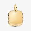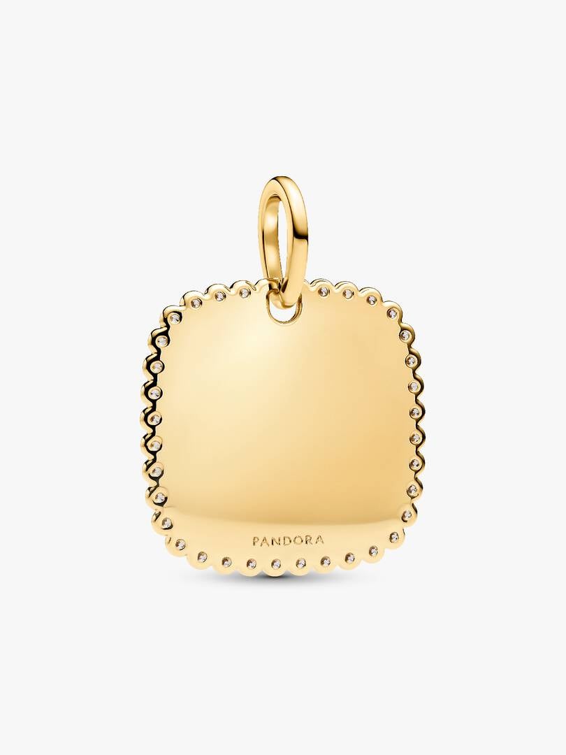 Minimalist style that makes a statement. Add our 14k gold-plated engravable square disc pendant, outlined in a frame of sparkling stones, to your collection.