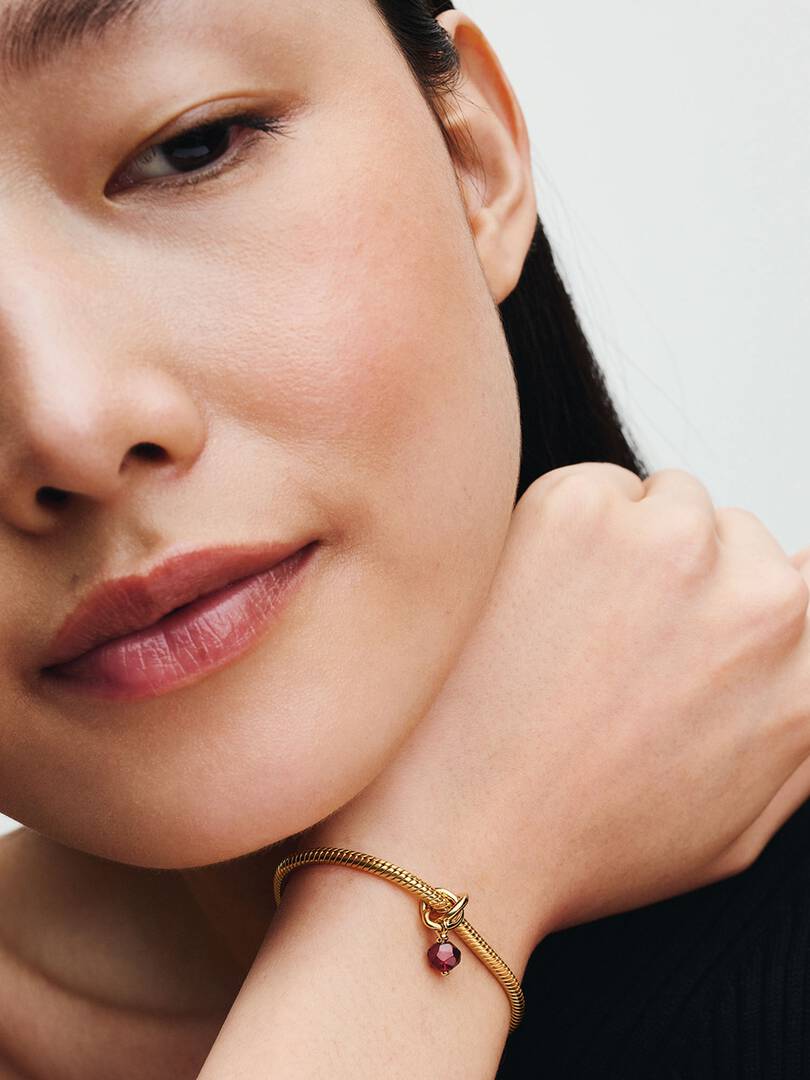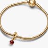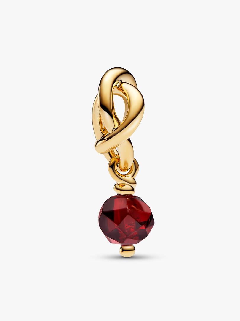 Wear a symbol of forever, that’s personal to you. This 14k gold-plated dangle charm is made up of a triple knotted circle that intertwines to resemble an infinity sign. The twist carries a faceted salsa red man-made crys