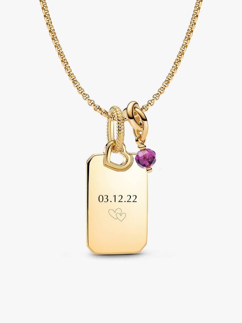 Celebrate love and connection with the February Engravable Dangle Charm Necklace Set. This set features the versatile Rolo Chain Necklace, made from polished 14k gold-plated metal, and an Engravable Rectangle Tag Pendant