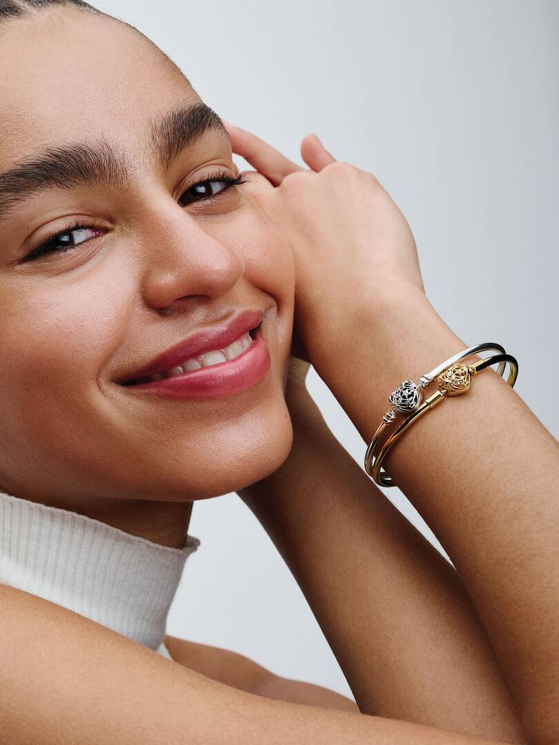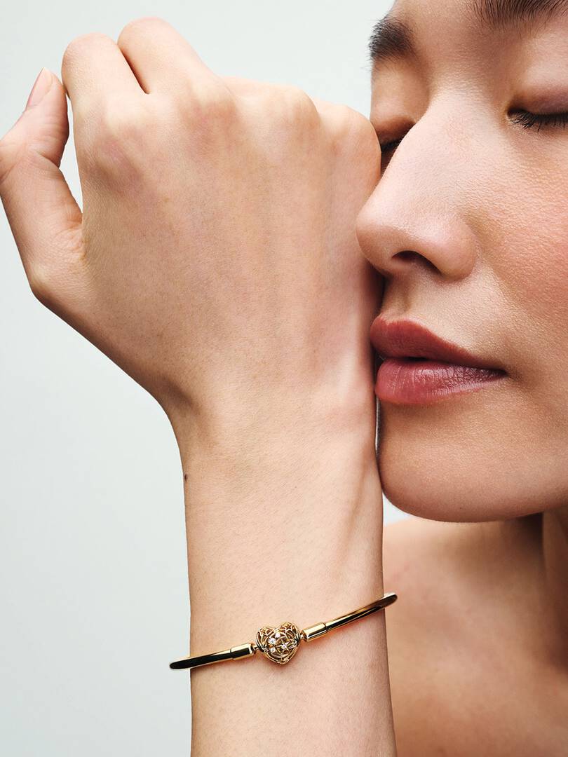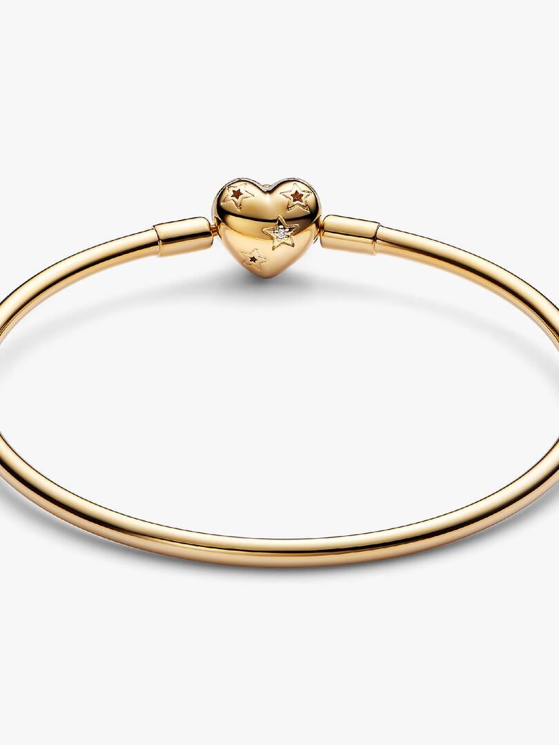 Fall in love with our Celestial Heart Clasp Bangle. Plated in 14k gold, our iconic heart clasp gets a stellar update, featuring a moonlit night sky complete with sparkling stones. Whether you wear it with or without char