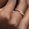 The outer band features clear cubic zirconia pavé framed by micro-beading, the sides have the brand logo and the inner shank has cut-out hearts. There are two brand Crown O monograms at the end of each profile. Subtly stunning on its own or show-stopping when multiple are stacked together, this ring makes a clean, chic statement.