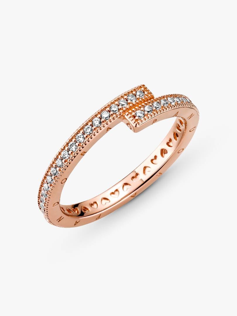 Opt for modern minimalism with the Sparkling Overlapping Ring. This hand-finished, 14k rose gold-plated ring features an asymmetrical design where the square ends of the band slightly overlap to create 90-degree angles.