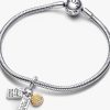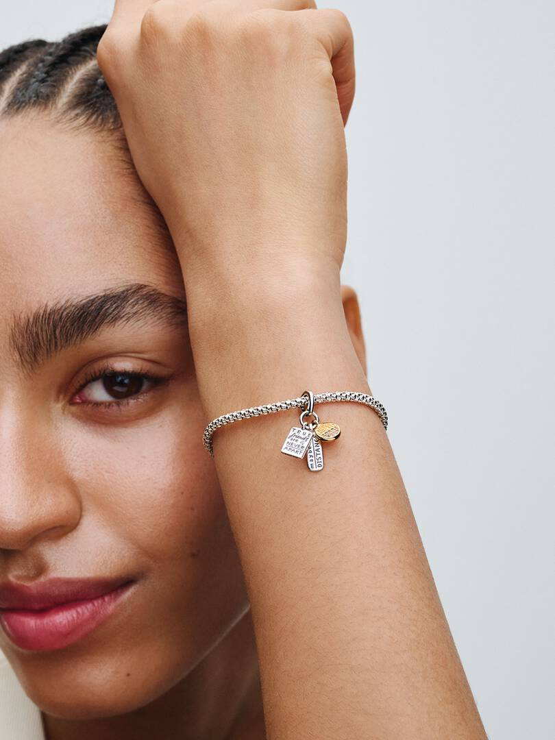 A tribute to your forever friends. This two-tone friends charm has three dangles, with engravings that read “TRUE friends are NEVER APART”, “maybe in DISTANCE”, “but NEVER in HEART”, with pavé details and two interlinked