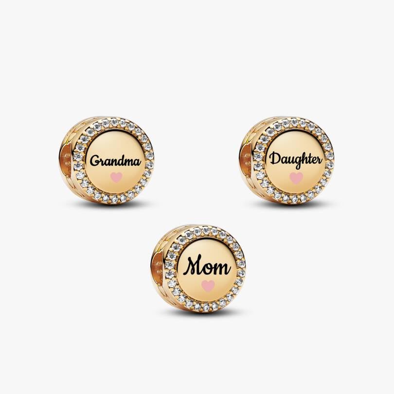 Celebrate family love with the Generations of Love Charm Trio. Featuring 14k gold-plated charms for Mom, Daughter, and Grandma, each with pavé cubic zirconia and engravable backs, this set honors lasting bonds.