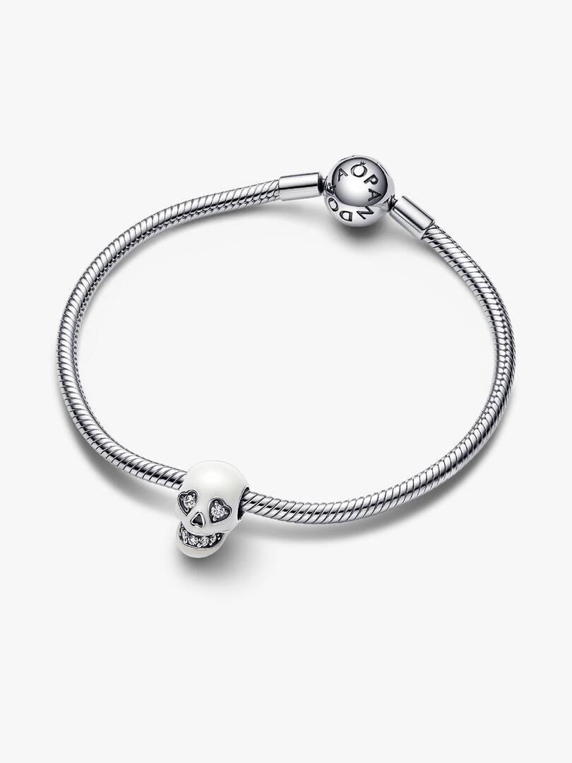 Add some edge to your look when you wear the Glow-in-the-dark Sparkling Skull Charm. This sterling silver charm features a skull covered in glow-in-the-dark enamel with a mouth and heart-shaped eyes sparkling with clear