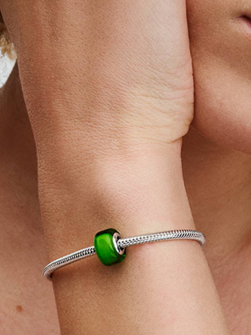 Add a splash of color to your charm styling with our Green Mini Murano Glass Charm. This new charm design has a smaller size than our other Murano charms and a slightly squared shape, creating new ways to play with color