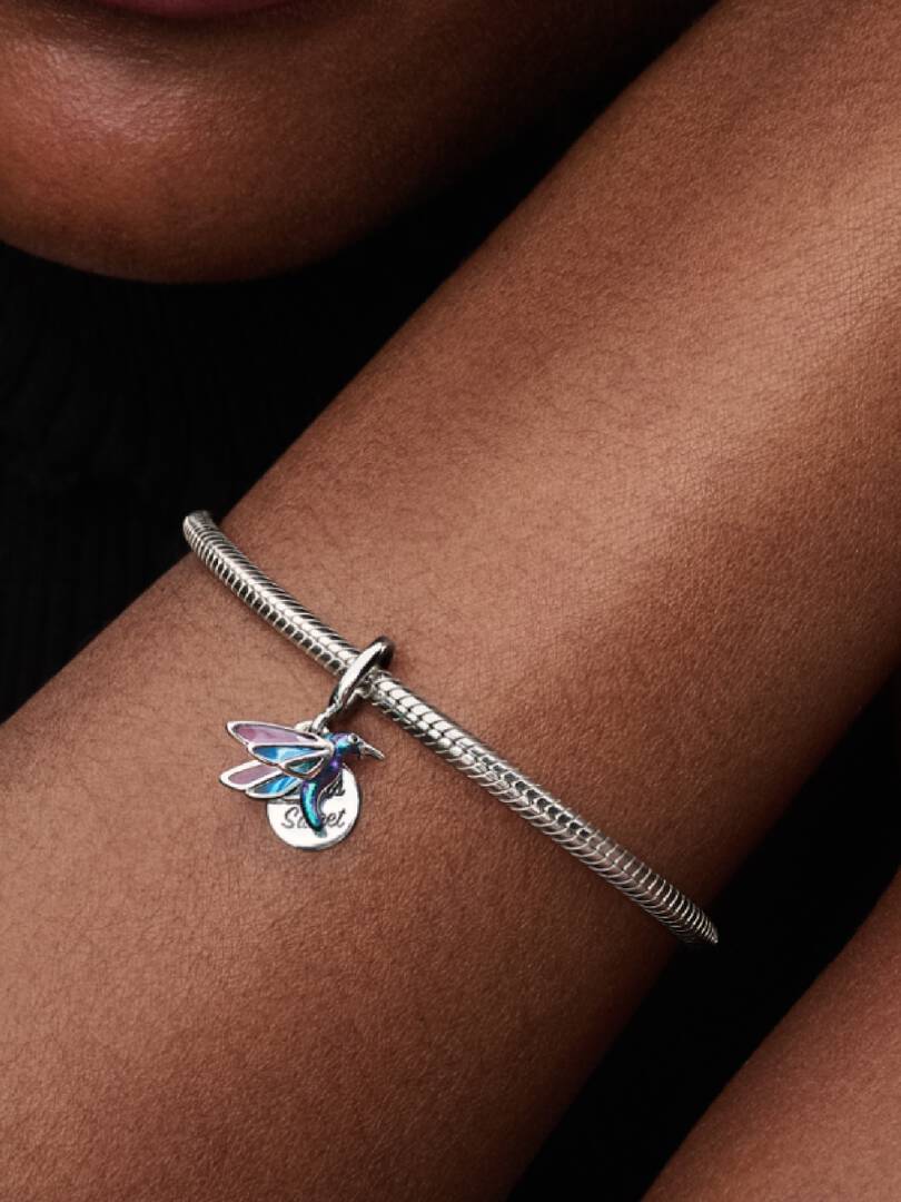 This shimmering hummingbird charm is crafted from sterling silver and features the message “Life is Sweet”. Transparent enamel wings and iridescent enamel on the body capture the lightness and grace of a hummingbird in f
