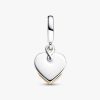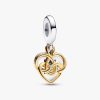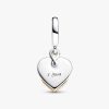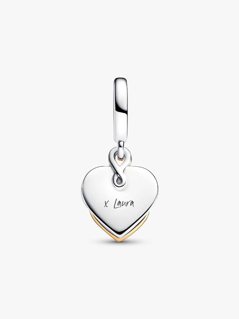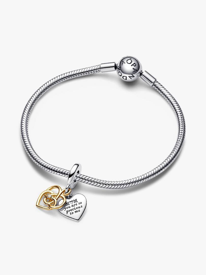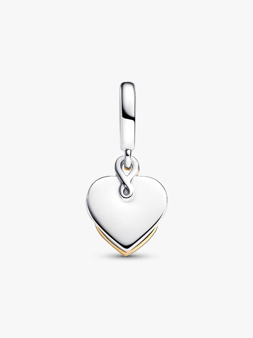 The power of motherly love shines bright in our Lab-grown Diamond Engravable Mom Double Dangle Charm. Featuring a 14k gold-plated heart motif on a heart-shaped disc intertwined with a knot-inspired openwork heart, it emb