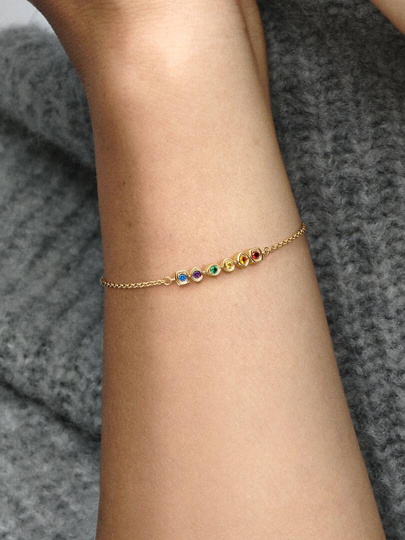 Wear your fandom in full color with the Marvel The Avengers Infinity Stones Chain Bracelet. This 14k gold-plated bracelet joins the Marvel x brand collection with man-made multicolored crystals and meaningful engraving