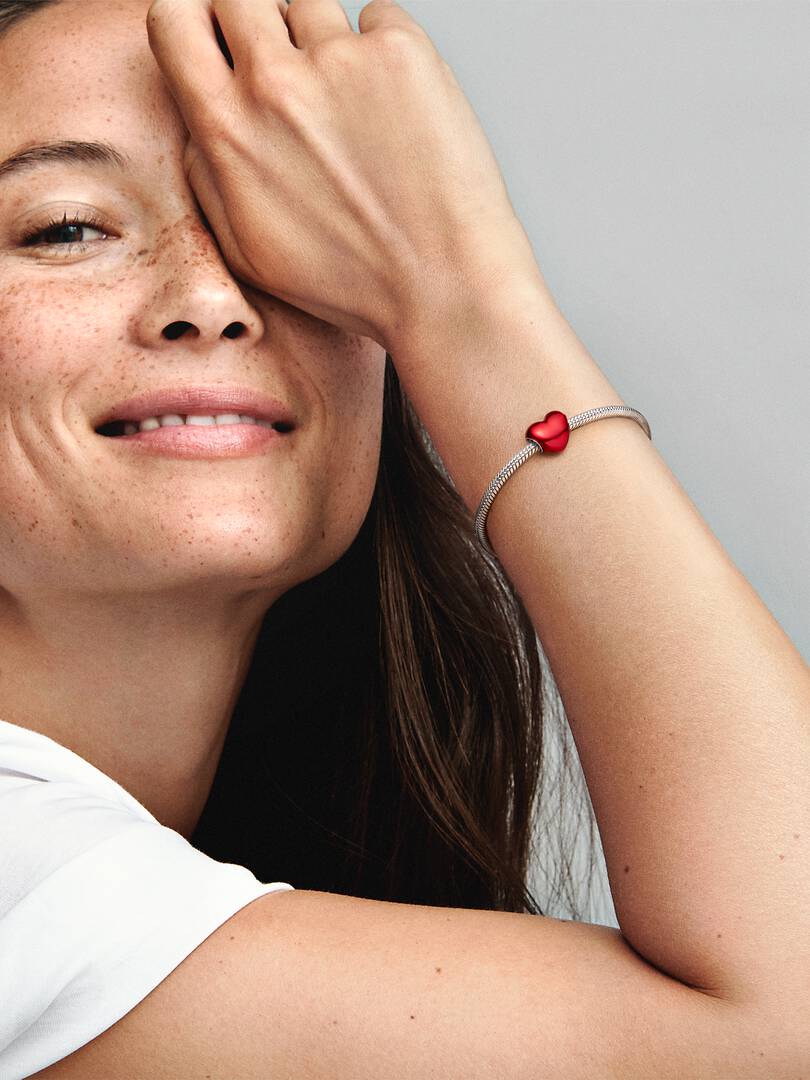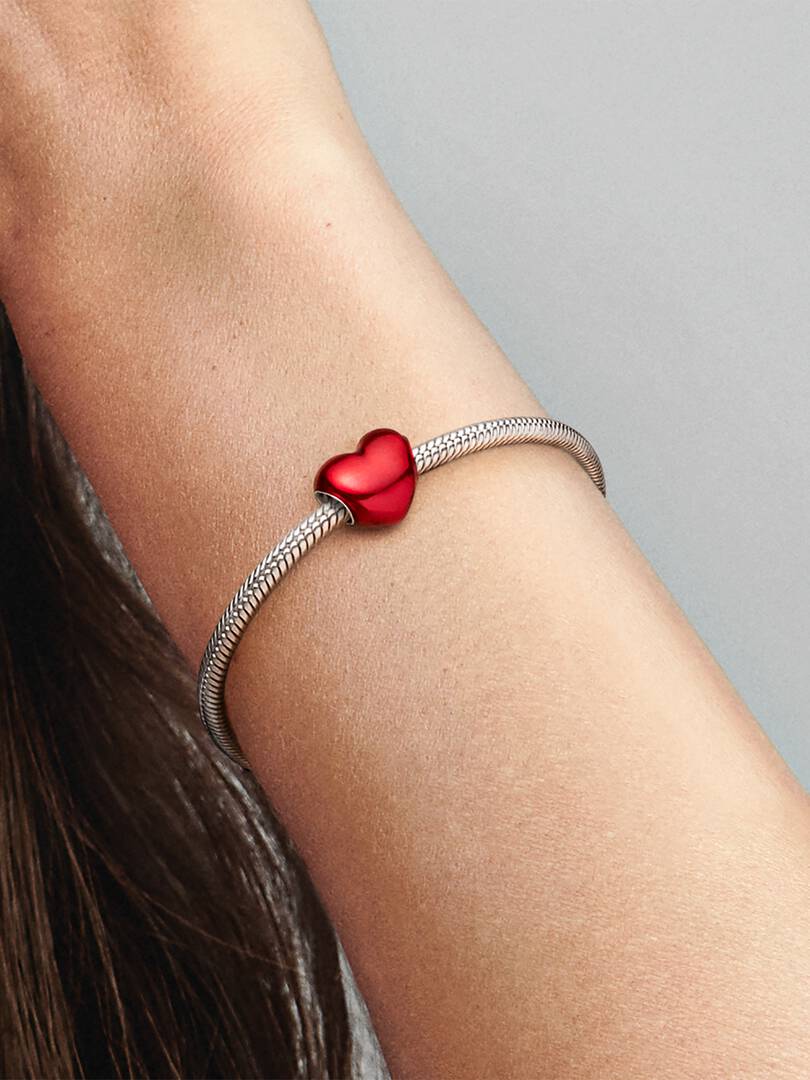 Make your style pop with the Metallic Red Heart Charm. Hand-finished in sterling silver, this heart-shaped piece is decorated with hand-applied transparent red enamel so that the base shines through. The perfect balance