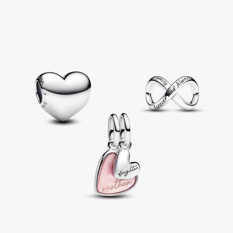 The Mom Infinity Love Charm Trio celebrates timeless bonds. Featuring a split Mother & Daughter heart, an infinity symbol for family, and an engravable heart, this set captures love that lasts forever.