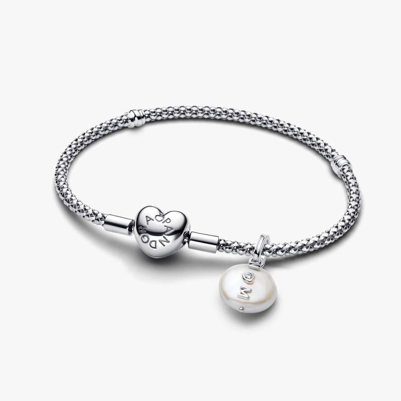 Celebrate Mom with the Mother’s Day Pearl Charm Bracelet Set. Featuring a sterling silver studded chain bracelet with a heart clasp and a baroque pearl charm engraved with “M♥M” for a unique, meaningful gift.