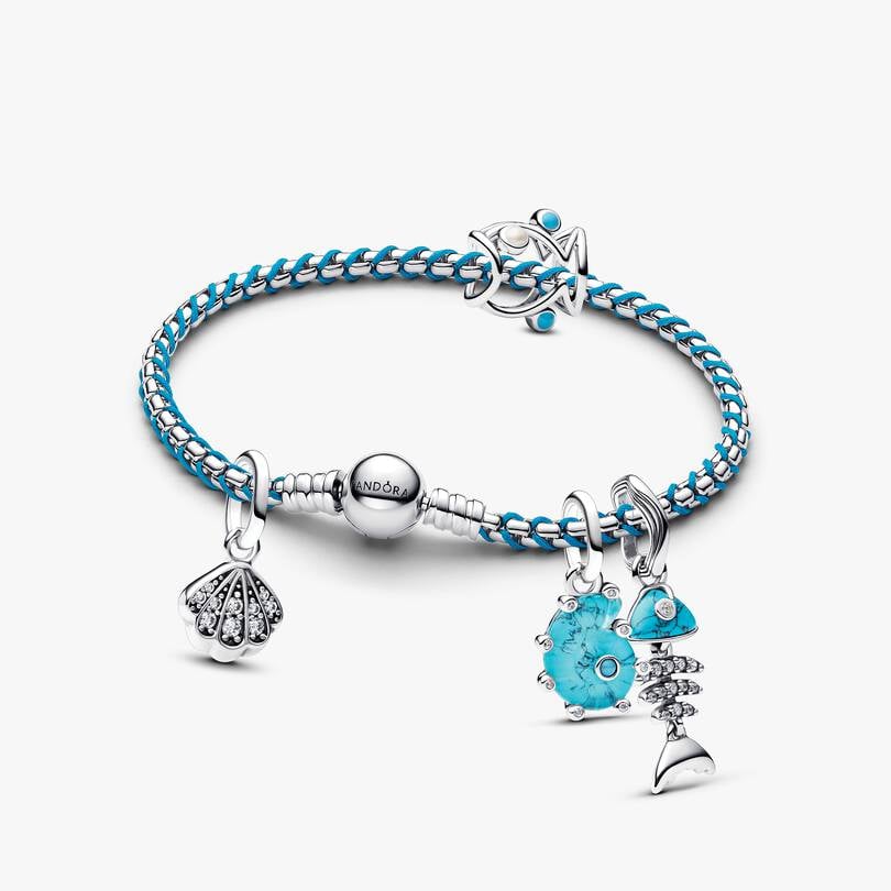 Wrap ocean memories around your wrist. This set includes the Blue Cord Snake Chain Bracelet and ocean-inspired charms crafted in sterling silver. Features turquoise-colored stones and blue Murano glass details.