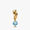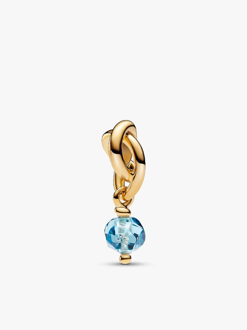 For the month of March, sea aqua blue. Inspired by the positive power each color brings, our Eternity Circle dangle charm gets a glow up in 14k gold-plating with a new faceted stone cut design and intricate triple knotte