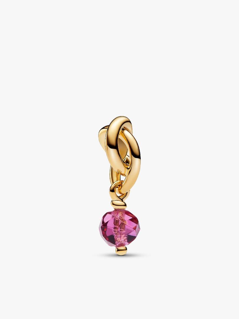 For the month of October, phlox pink. Inspired by the positive power each color brings, our Eternity Circle dangle charm gets a glow up in 14k gold-plating with a new faceted stone cut design and intricate triple knotted