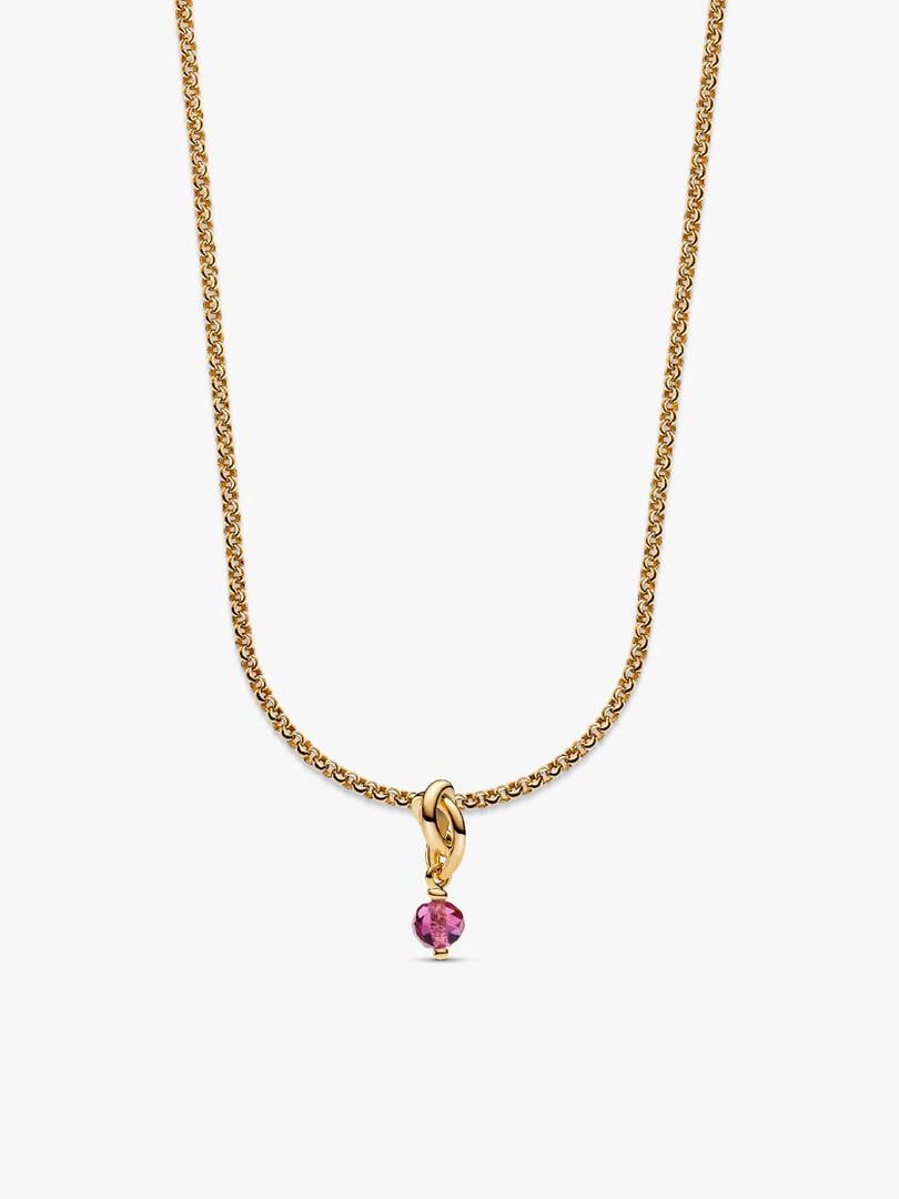 circle above. With its twisted infinity motif and lovely pop of pink, October’s symbolic charm is perfectly styled on a 14k gold-plated chain necklace for a look that’s as beautiful as the birthday it celebrates.