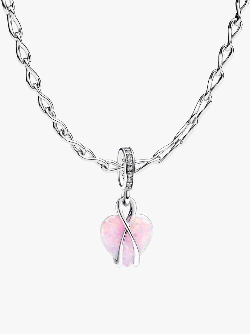 Crafted in sterling silver, this set features the heartwarming Mom Opalescent Heart Dangle Charm and the elegant Infinity Chain Necklace. The charm showcases a heart-shaped pink lab-created opal, adorned with a spectrum