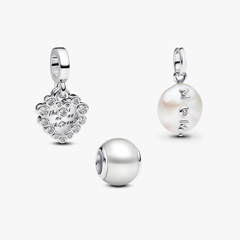 Celebrate love with the “There is No One Like You” Charm Trio. Includes a baroque pearl Mum charm, a white pearl charm, and a sparkling heart charm with “There is no one like you” engraving. Perfect for cherished bonds.