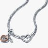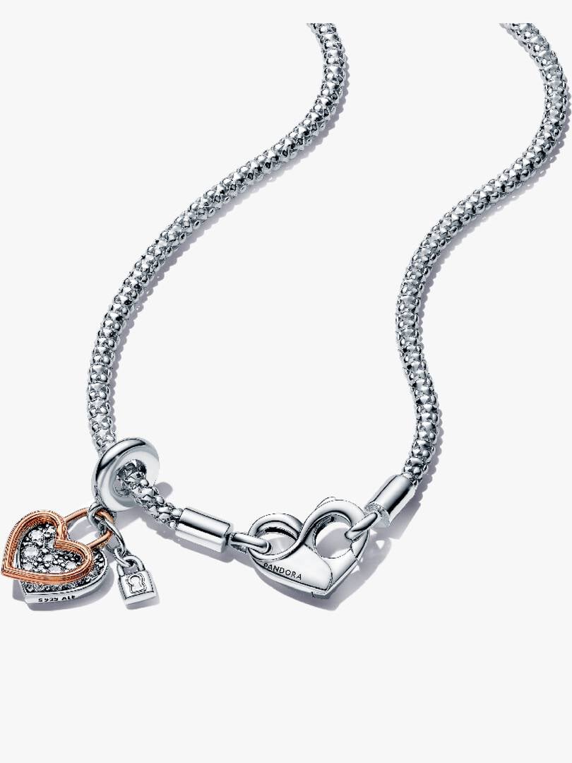 arms. Style it with your favorite charms and any size of brand O Pendants. It comes with a heart-shaped double dangle charm features an open heart silhouette in 14k rose gold plating, outlining a sterling silver pavé heart. It is decorated with a tiny padlock, inspired by the love locks that sweethearts place on bridges around the world. On the back heart-shaped disc, the engraving “Together always” is engraved and holds the two elements next to each other, symbolizing two hearts coming together as one.