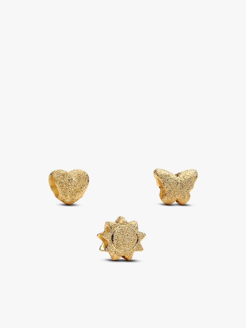 A heart for love. A butterfly for renewal. A sun for joy. Three symbolic charms made mini. Each piece is crafted in 14k gold plating with a diamond-point texture for subtle shine that speaks volumes.