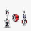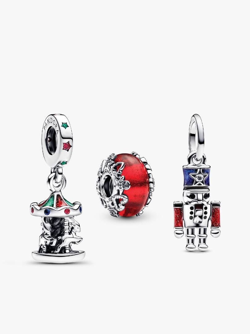 neath glittery enamel and sparkling stones, with a heartfelt engraving, “HAPPINESS, JOY, PEACE, HOPE, LOVE” on the base. The moveable nutcracker dangle charm, with its sterling silver body, lever-action mouth, and vibrant blue enamel uniform, brings playful holiday spirit, topped with a sparkling stone in the star on his hat. Completing the trio, the Christmas Magic Murano Glass Charm glows with red glass wrapped in golden foil, while sterling silver Christmas trees, gingerbread men, and candy canes dance around the sides adding an extra festive touch.