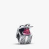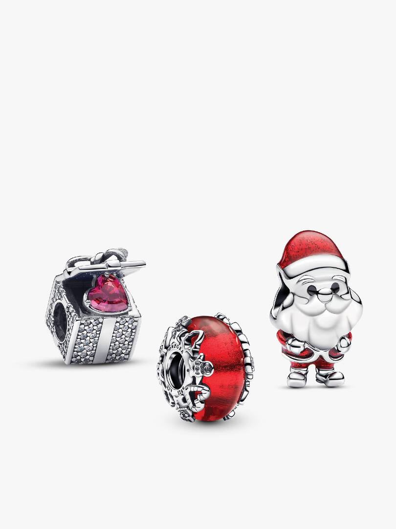 iconic outfit and lifelike facial details—his body even moves side to side for an extra playful touch. The second charm is an open present, adorned with ribbon details, sparkling pavé, and a radiant red heart-shaped stone inside. Engraved with the message “THE GIFT OF L♥VE,” it celebrates the joy of giving. Completing the trio, the red Murano glass charm glows warmly with golden foil and is wrapped in sterling silver Christmas trees, gingerbread men, and candy canes, adding festive cheer to any jewelry collection.