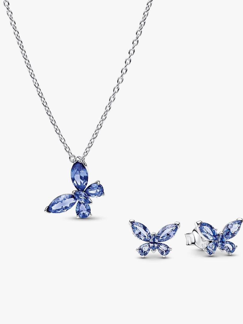 Give a gift that flutters and shines. Our timeless butterfly-themed gift set features a collier necklace and stud earrings in sterling silver, set with blue man-made crystals for a pop of vibrant colour.