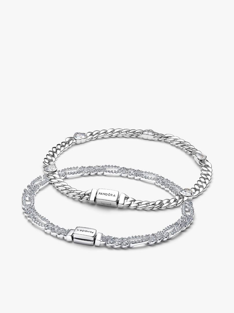 One for you, one for them. This set features two of our bestselling sterling silver Cuban chain bracelets. One is set with heart-shaped stones and the other is crafted with oval links and sparkling pavé.