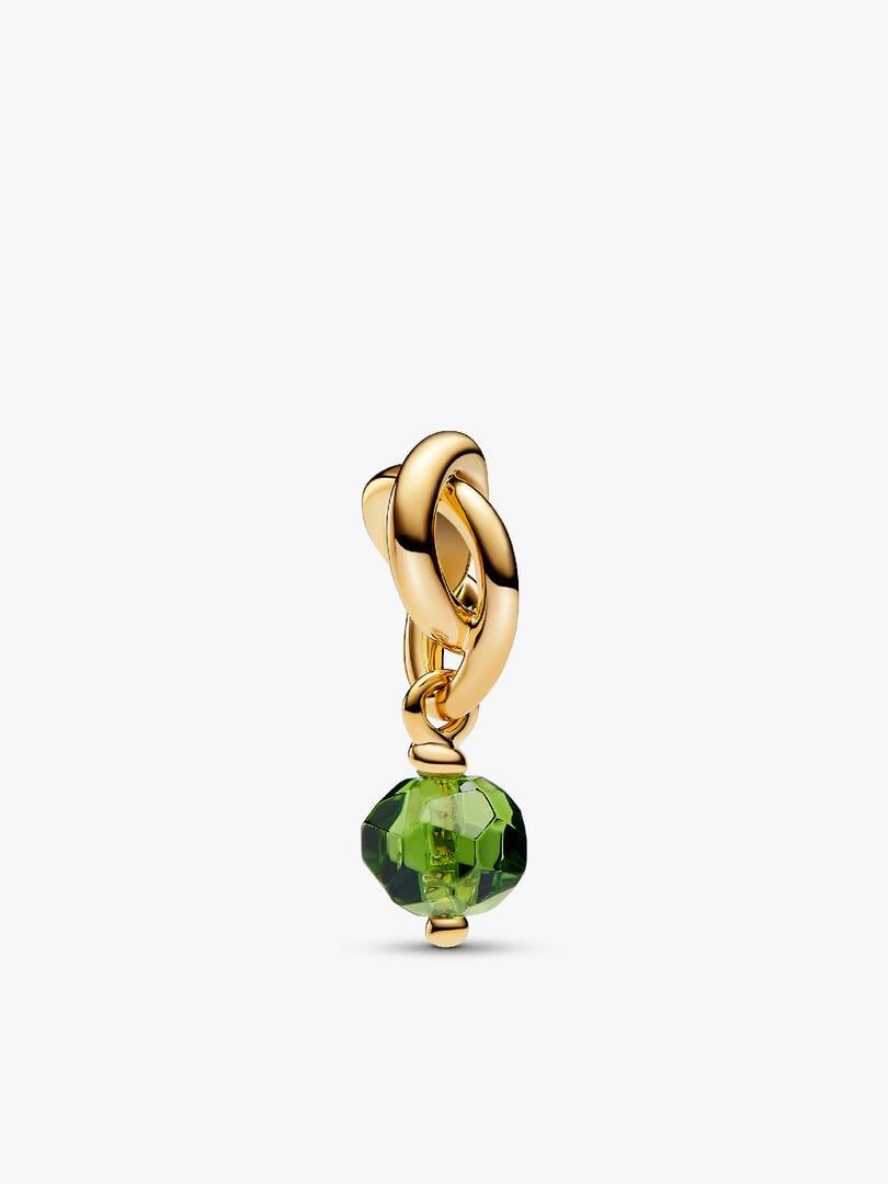 For the month of August, spring green. Inspired by the positive power each color brings, our Eternity Circle dangle charm gets a glow up in 14k gold-plating with a new faceted stone cut design and intricate triple knotte
