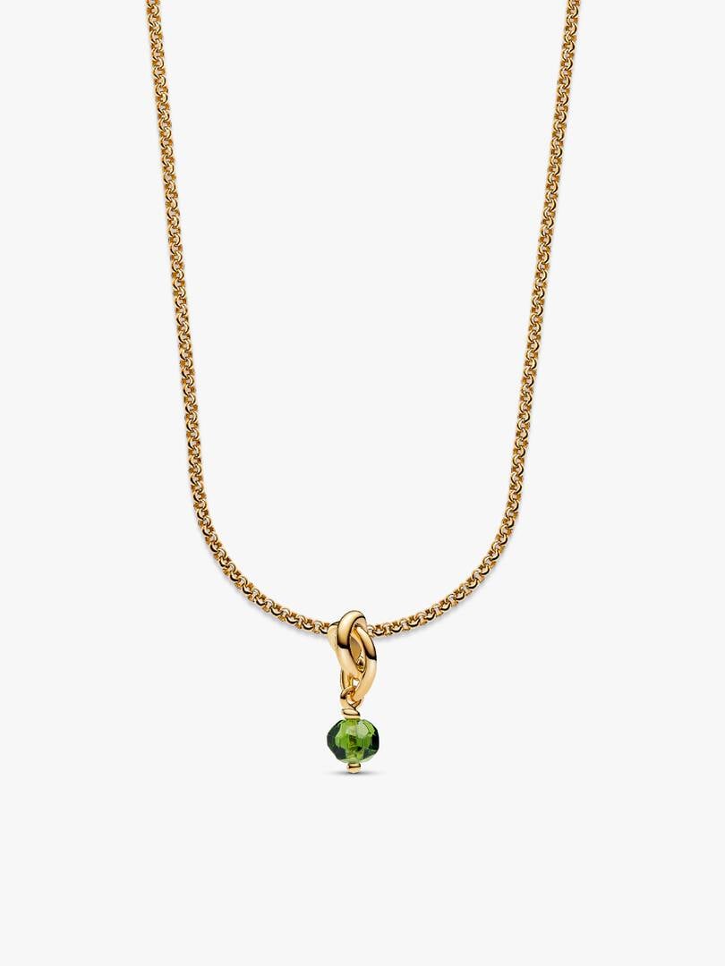 d circle above. With its twisted infinity motif and lovely pop of green, August’s symbolic charm is perfectly styled on a 14k gold-plated chain necklace for a look that’s as beautiful as the birthday it celebrates.
