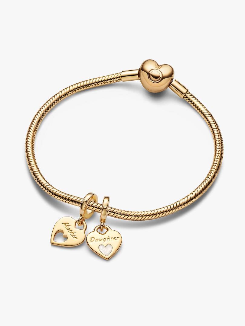 Two beautiful pieces of jewelry celebrate the special bond between a mother and daughter in this heartwarming set. Included is the Double Heart Split Dangle Charm, a 14k gold plated double dangle charm, one with a cut-ou