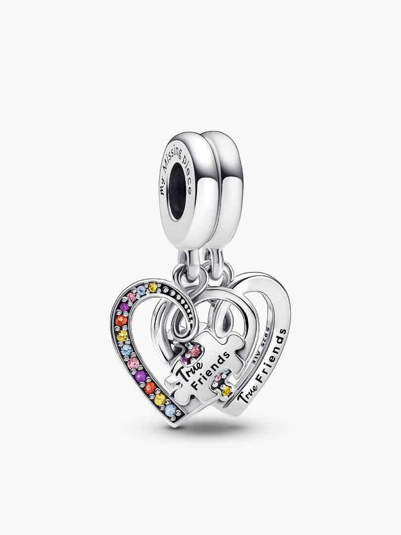 he Puzzle Piece Hearts Splittable Friendship Dangle Charm is designed with blue, orange, yellow, purple and pink stones and microbeads on half of a heart outline, “True Friends” engraved on a polished puzzle piece, and “My Missing Piece” engraved on one side of the bail.