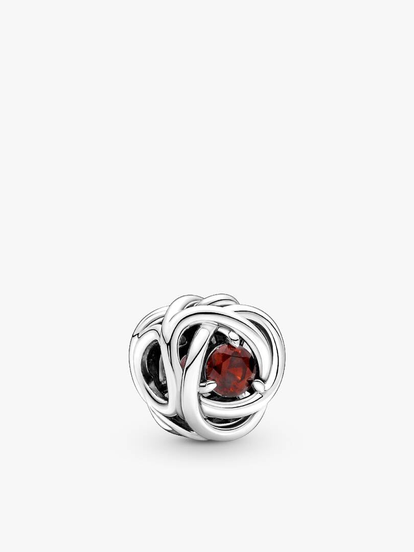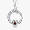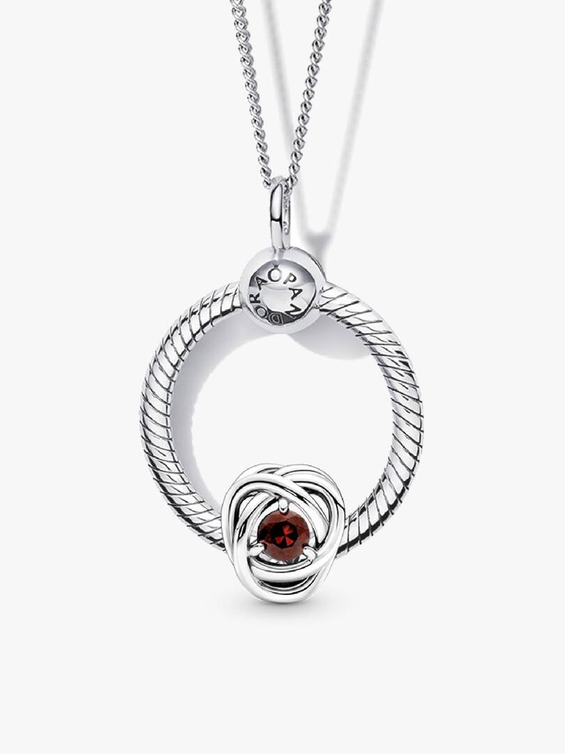 A Classic Cable Chain Necklace in sterling silver, a snake-chain patterned brand Moments Small O Pendant, and a Red Eternity Circle Charm with openwork infinity braiding design and a salsa-red crystal lighting up the c