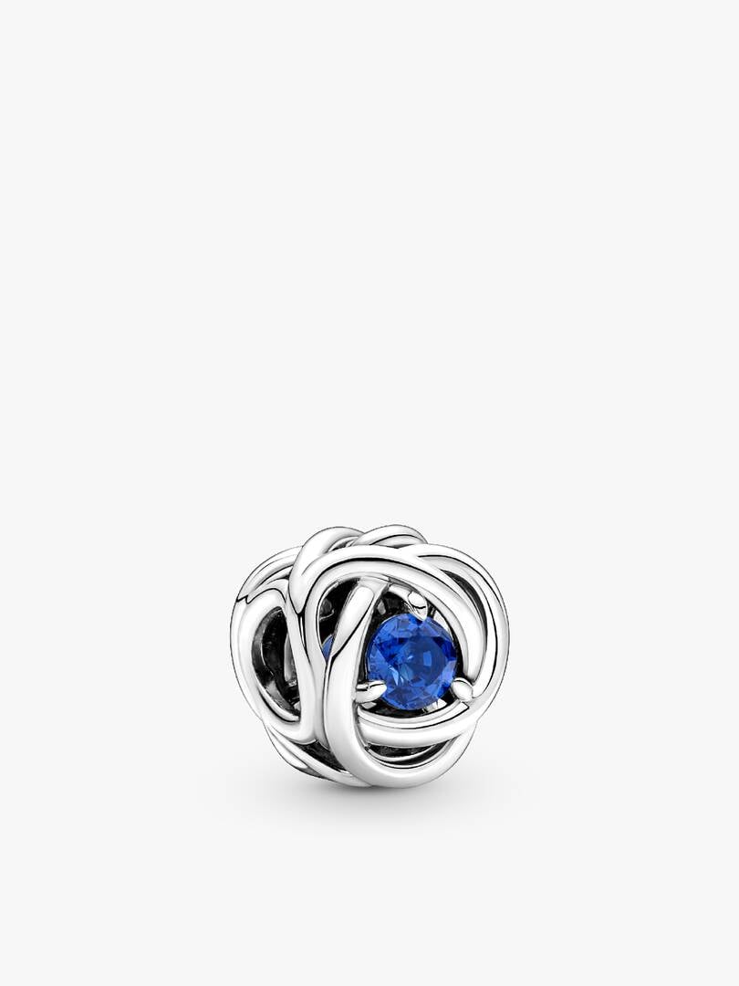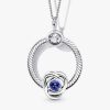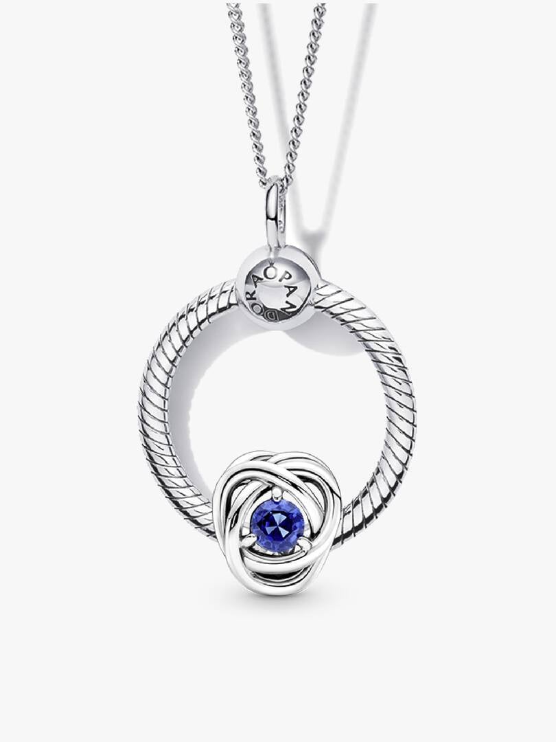 Blue Eternity Circle Charm with an eye-catching princess blue man-made crystal center encircled by infinity braiding design, a snake-chain patterned brand Moments Small O Pendant, and a Classic Cable Chain Necklace in