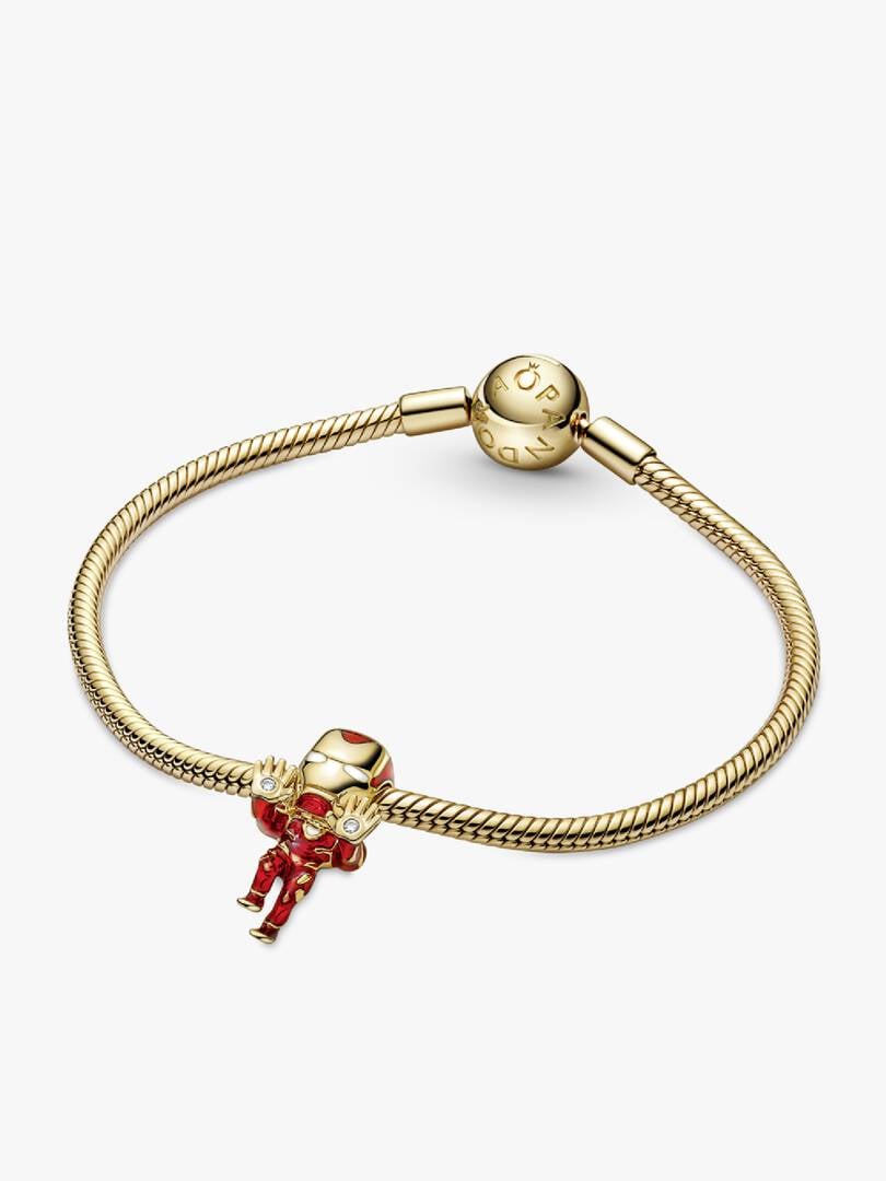 led heart-shaped arc reactor heart giving him life, with an inspiring message, “FIND YOUR POWER,” on his back, along with the The Avengers logo. This charm is carried on a sleek 14k gold-plated brand Moments Snake Chain Bracelet.